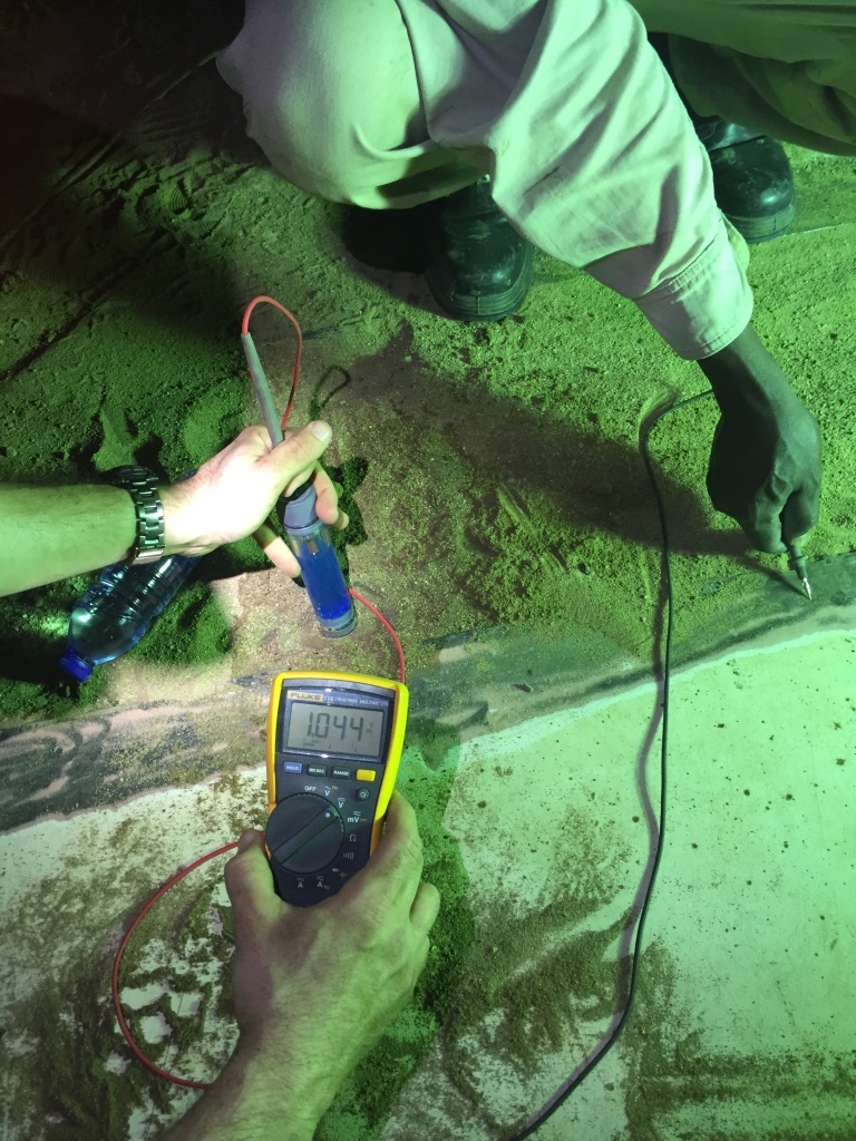 The system was composed by No. 12 concentric loops of MMO Titanium ribbon spaced of abt. 3 meters and connected together by No.12 conductor bars of pure Titanium installed along the radii of the bottom and welded together at the center. Polarization potentials are measured by No. 9 Zinc reference electrodes installed in a later stage.