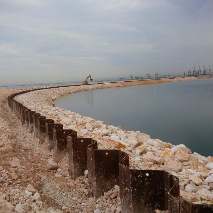 The area selected for the site was closed constructing a rock dam. The land-side was sealed using suitable plastic liners, and on the sea-side it was installed a sheet piling with sealed interlocks driven into the impermeable clay layer below the seabed. Thanks to this kind of construction, the muds that will be disposed inside the area will be completely separated from the surrounding environment, avoiding the seepage of pollutants.